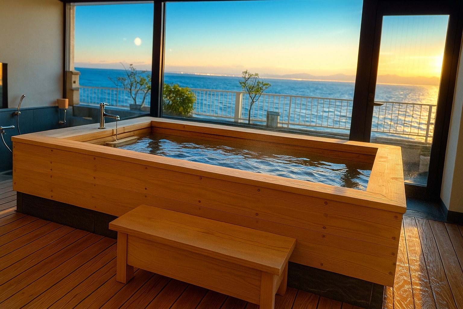 🌲 香り立つ檜風呂では、木のぬくもりとともに眼前に広がるオーシャンビューを体感いただけます。